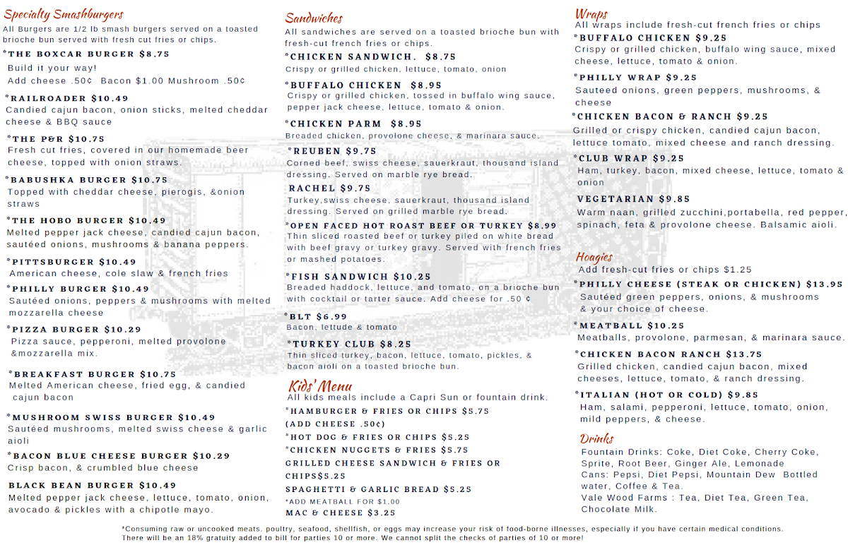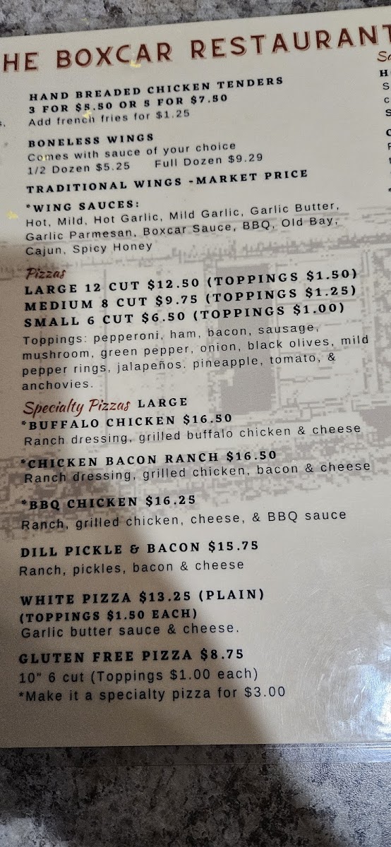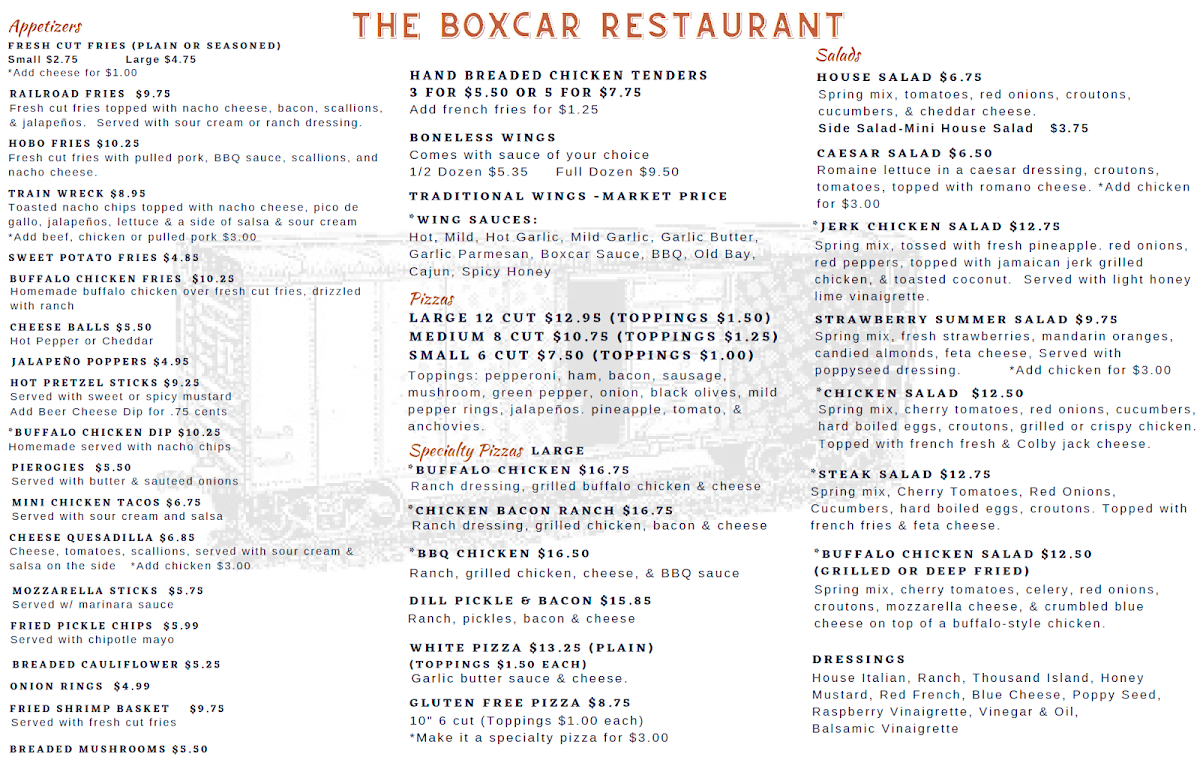 If you’re near the tracks in Lilly, Pennsylvania, there’s a cozy stop you shouldn’t miss - The Boxcar Restaurant Llc Menu brings together that small-town charm and hearty comfort food everyone loves. The place has a friendly, relaxed feel that fits perfectly with its railroad theme, and the dishes follow suit - simple, satisfying, and full of flavor. You’ll find all the homestyle favorites here, from crispy fried chicken and juicy burgers to freshly made sandwiches that hit the spot every time. Breakfast lovers are in luck too, with generous portions of eggs, pancakes, and biscuits served just the way you’d want them on a lazy weekend morning. Every plate feels familiar yet made with care, offering that comforting touch that keeps locals coming back. Located at 416 Railroad St, this hidden gem feels like the kind of diner you stumble upon and never forget - the kind that makes you want to sit back, enjoy your meal, and watch the world roll by.
